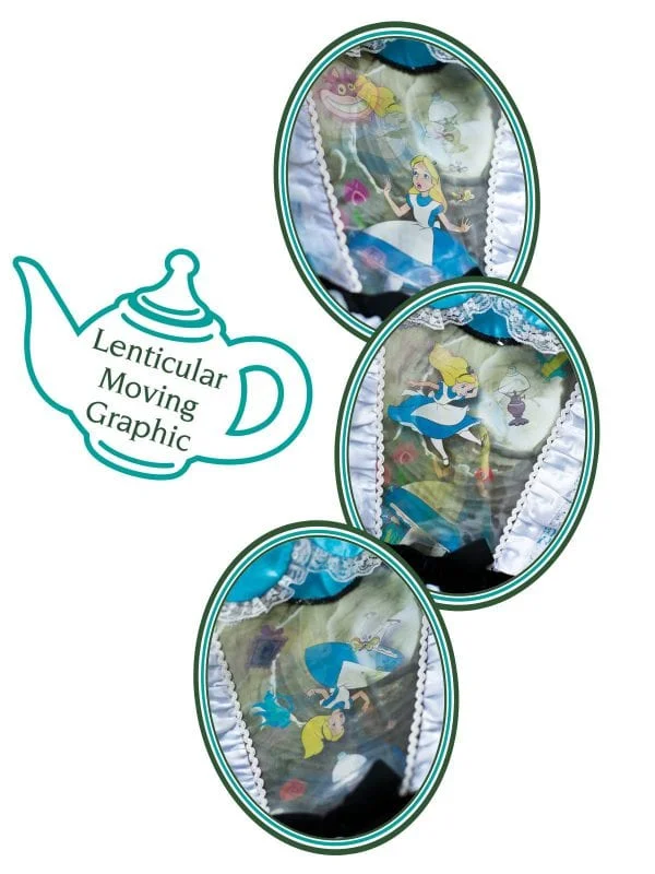 - Classic blue dress with satin bodice, featuring lenticular graphic panel at chest. Panel shows Alice falling down the rabbit hole with the cheshire cat and garden imagery. Changes in light create a different visual