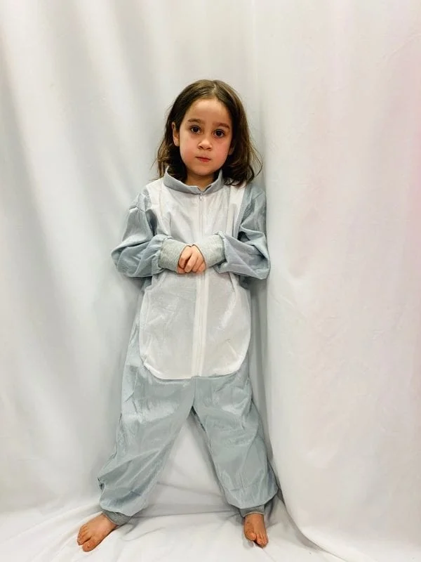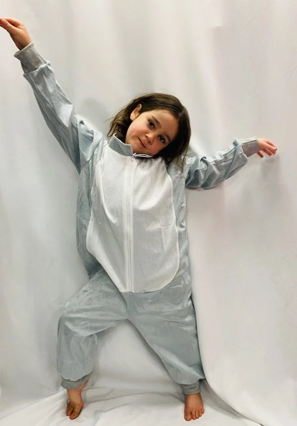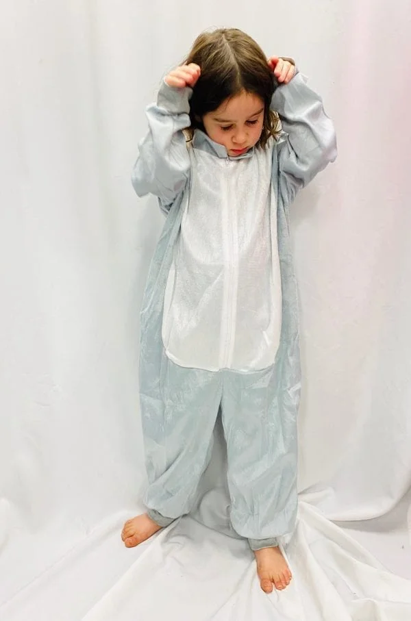 This grey & white all-in-one animal onesie is an easy-to-wear outfit, and can be paired up with different masks and headwear to become different animals. Great for Bookweek or any school dress-up day event!