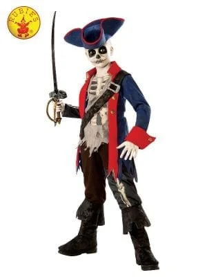 - Printed Captains jacket with red panels and gold buttons, plus mock shirt front with digitally printed skeleton image and cheese cloth overlay. Sleeves with exaggerated cuff and gold button