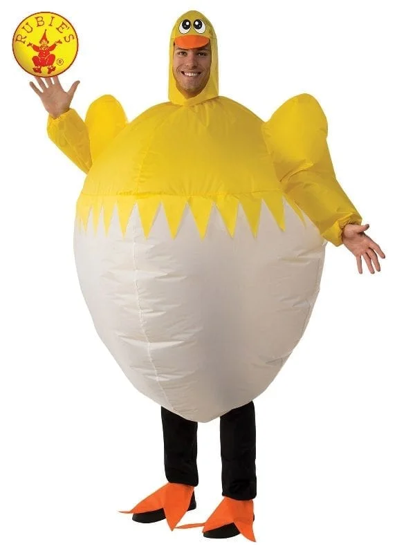 - Over-sized plastic inflatable jumpsuit in chicken design plus separate headpiece with velcro fastens under chin