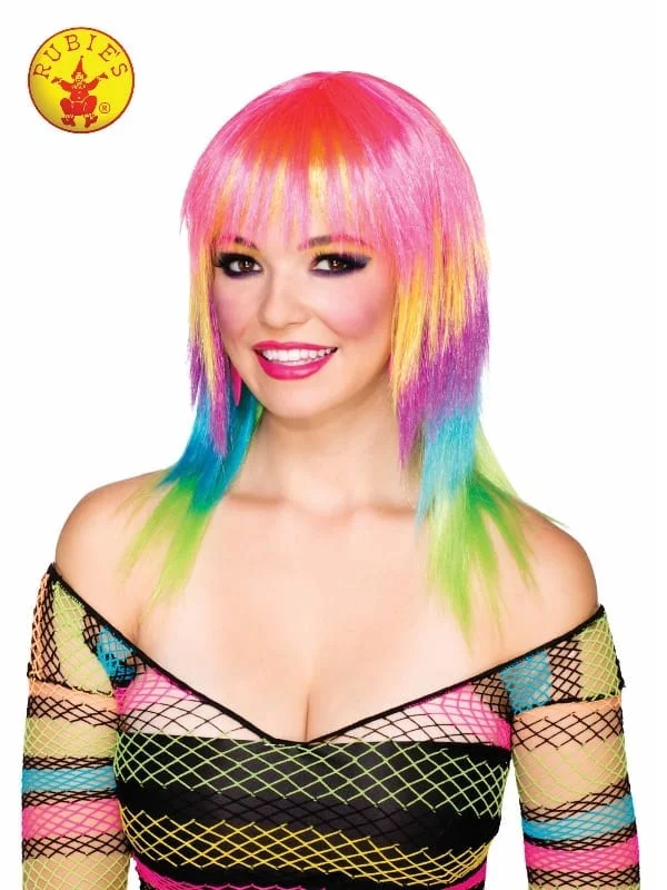 - Wig is styled with a fringe and rainbow ombre colourways from the fringe to the ends