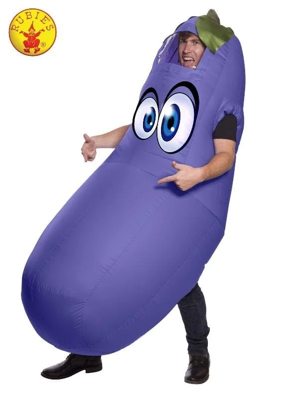 - Plastic inflatable full body eggplant jumpsuit in purple with zipper and clear vinyl port to see through