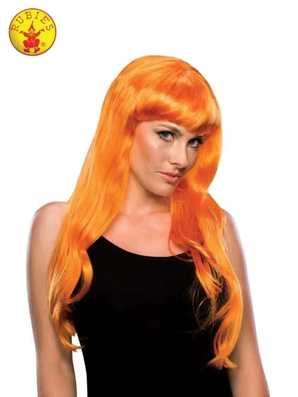 - Long, straight bright orange hair wig made from polypropylene hair strands