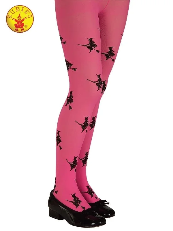 - Glittery pink full-length tights with printed witches riding on a broom stick in black print