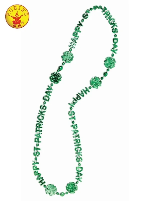 - Necklace has intermittent shamrocks and words HAPPY ST PATRICK’S DAY in plastic on the thread