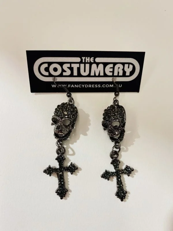Jewelled Black Skull & Cross Earrings
