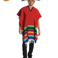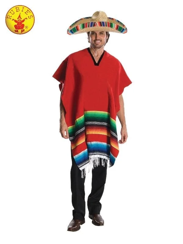 - Polyester red and rainbow coloured serape with slit for neck and open sides for arms