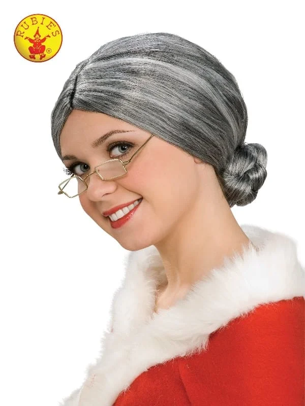 - Wig is grey in colour and has side part with low bun at rear