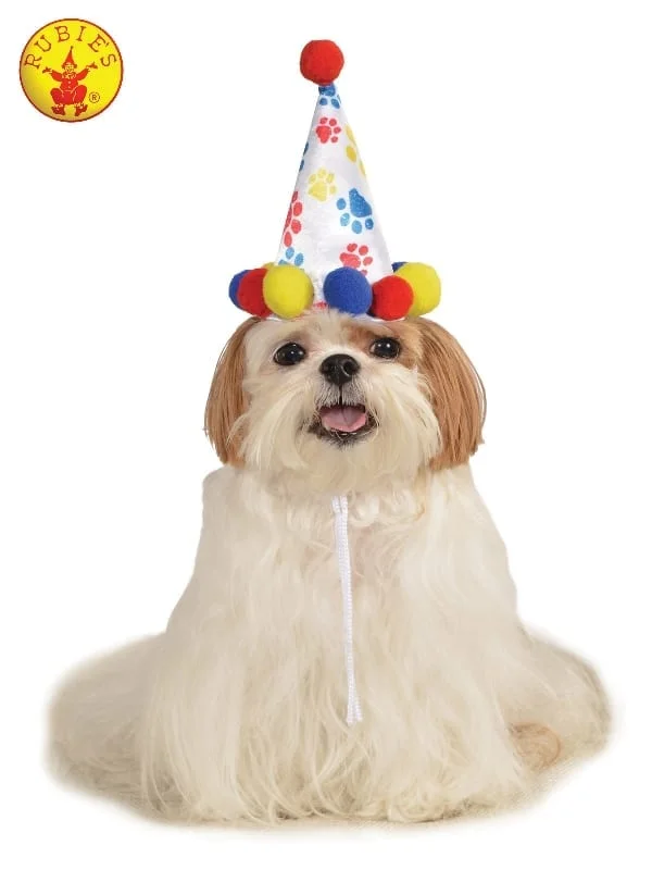 - Soft satin pointed hat with red, blue and yellow paw prints all over it