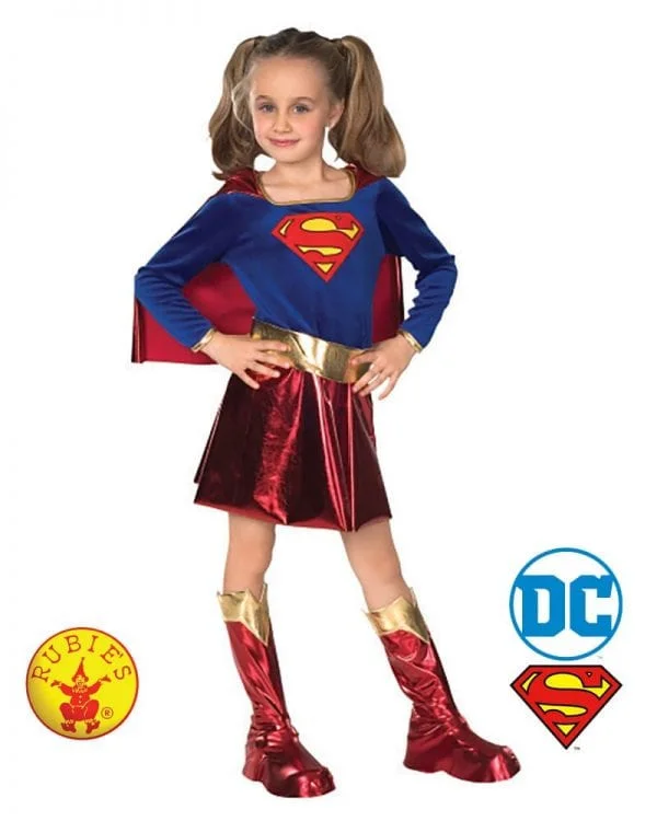 - Dress with Supergirl emblem printed on bodice, gold trim at neck line and attached cape in metallic fabric plus full length sleeves with gold trim at hem