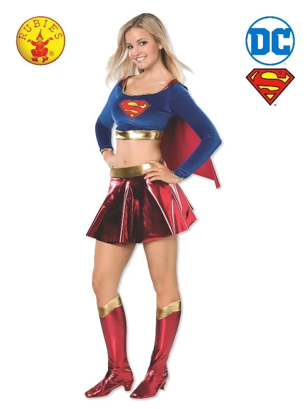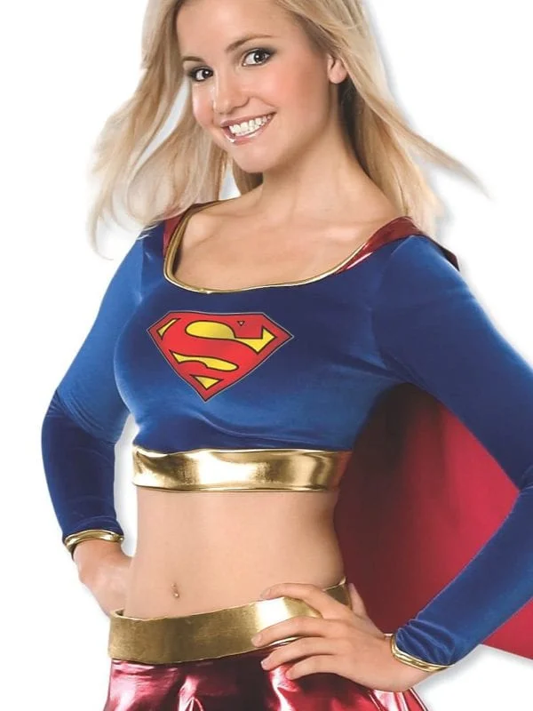 - Midriff top with scoop neckline with metallic trim, Supergirl emblem print on chest, metallic panel at waist and full length sleeves with metallic trim plus attached cape in metallic fabric