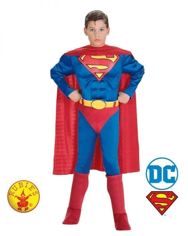 - Jumpsuit with moulded EVA muscle chest and large Superman emblem printed on chest, plus full length sleeves with fibre filled muscles and stitching detail