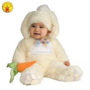 - Faux fur rabbit onesie costume featuring plush jumpsuit and attached colourful bow tie