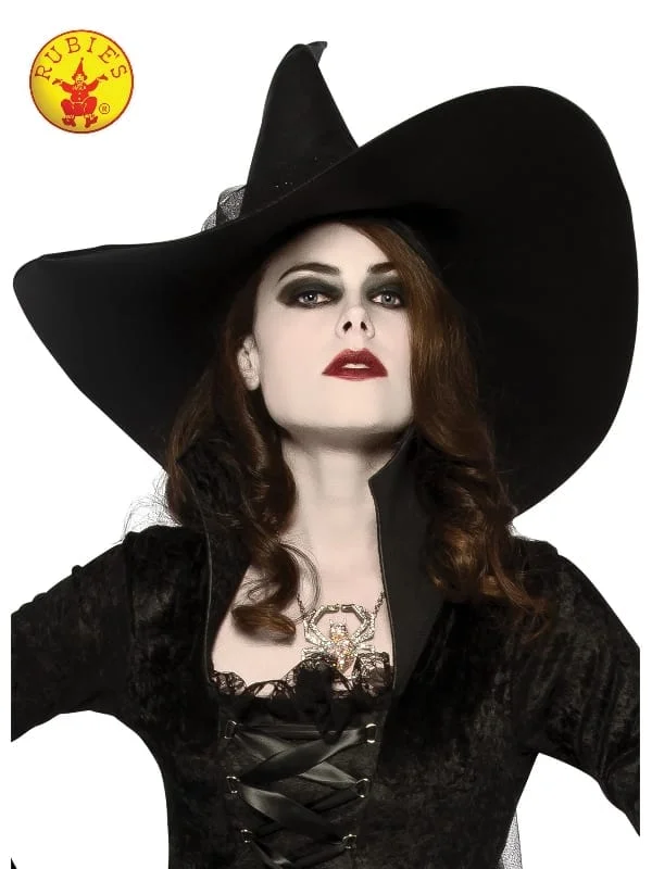 - Over-sized black pointed witches hat with angular brim and tulle embellishment